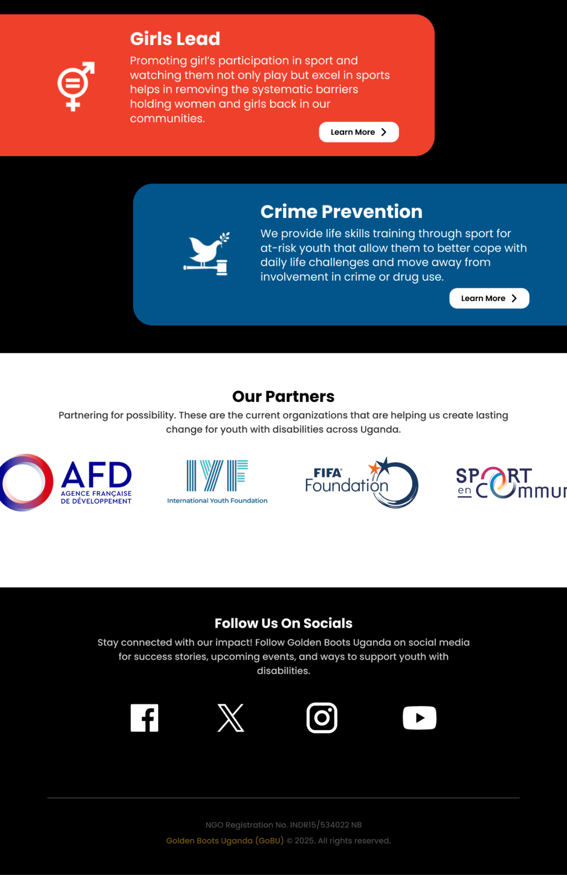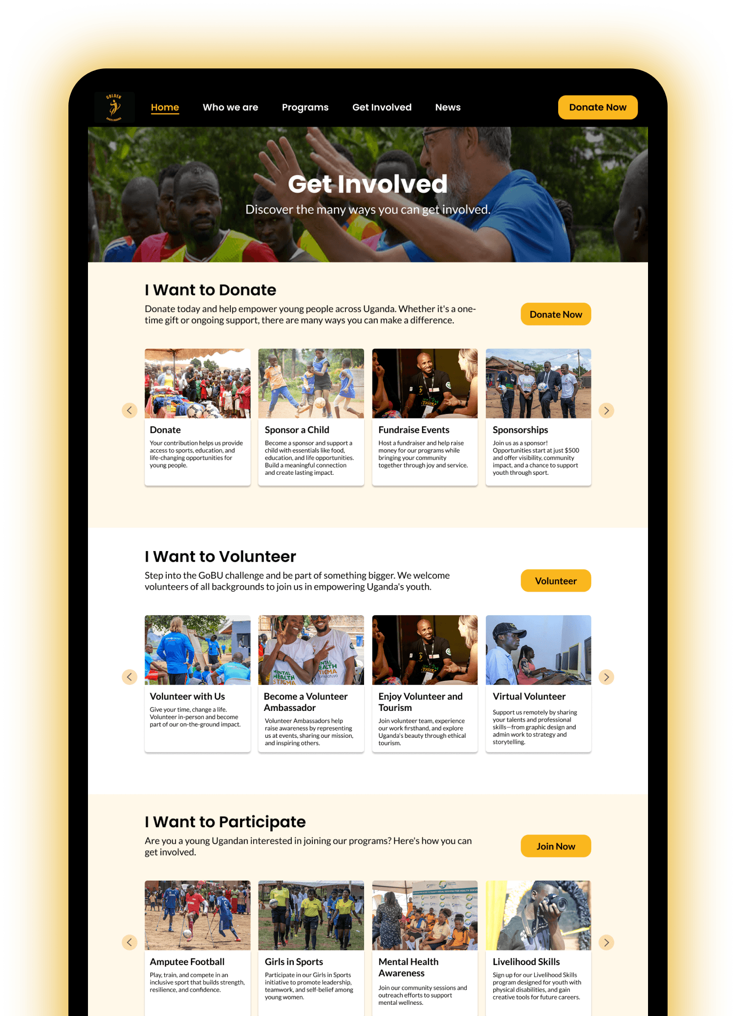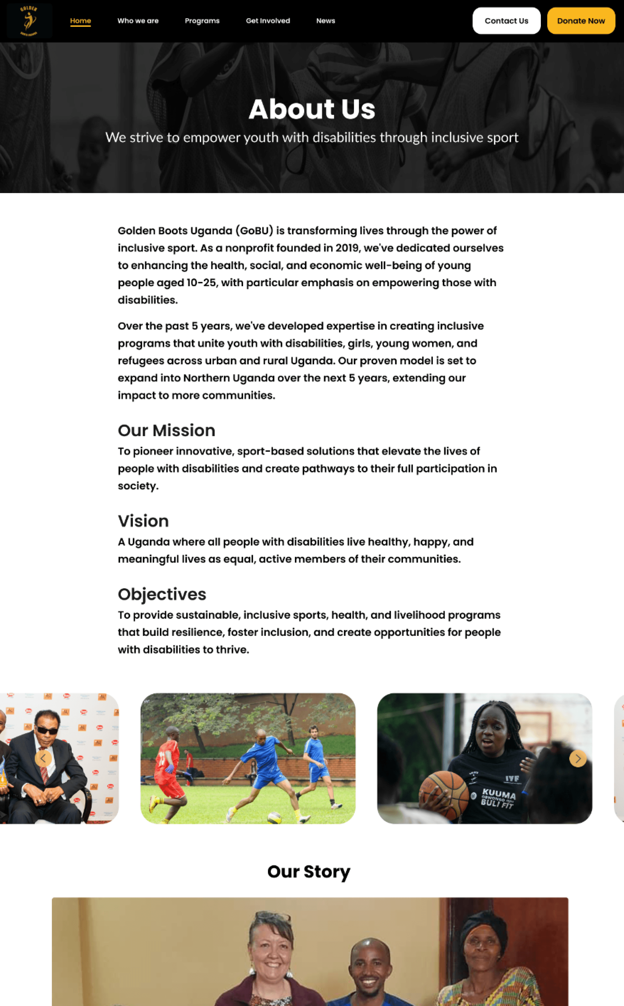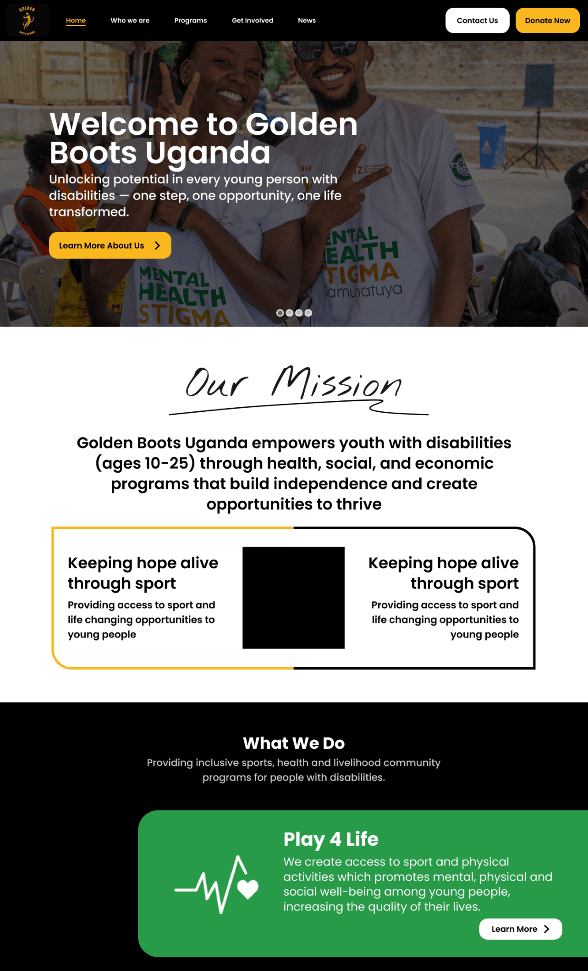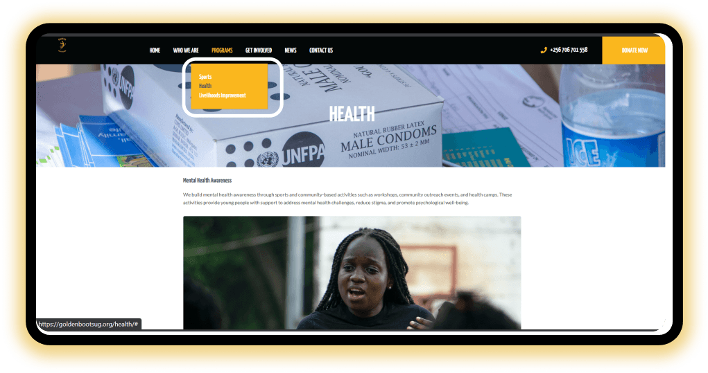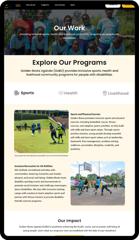 GoBU's home page was suffering from a mismatch between visuals and messaging. Further, the slow transitions, small text size, and less information hierarchy make it difficult for users to quickly grasp Golden Boots Uganda’s mission.