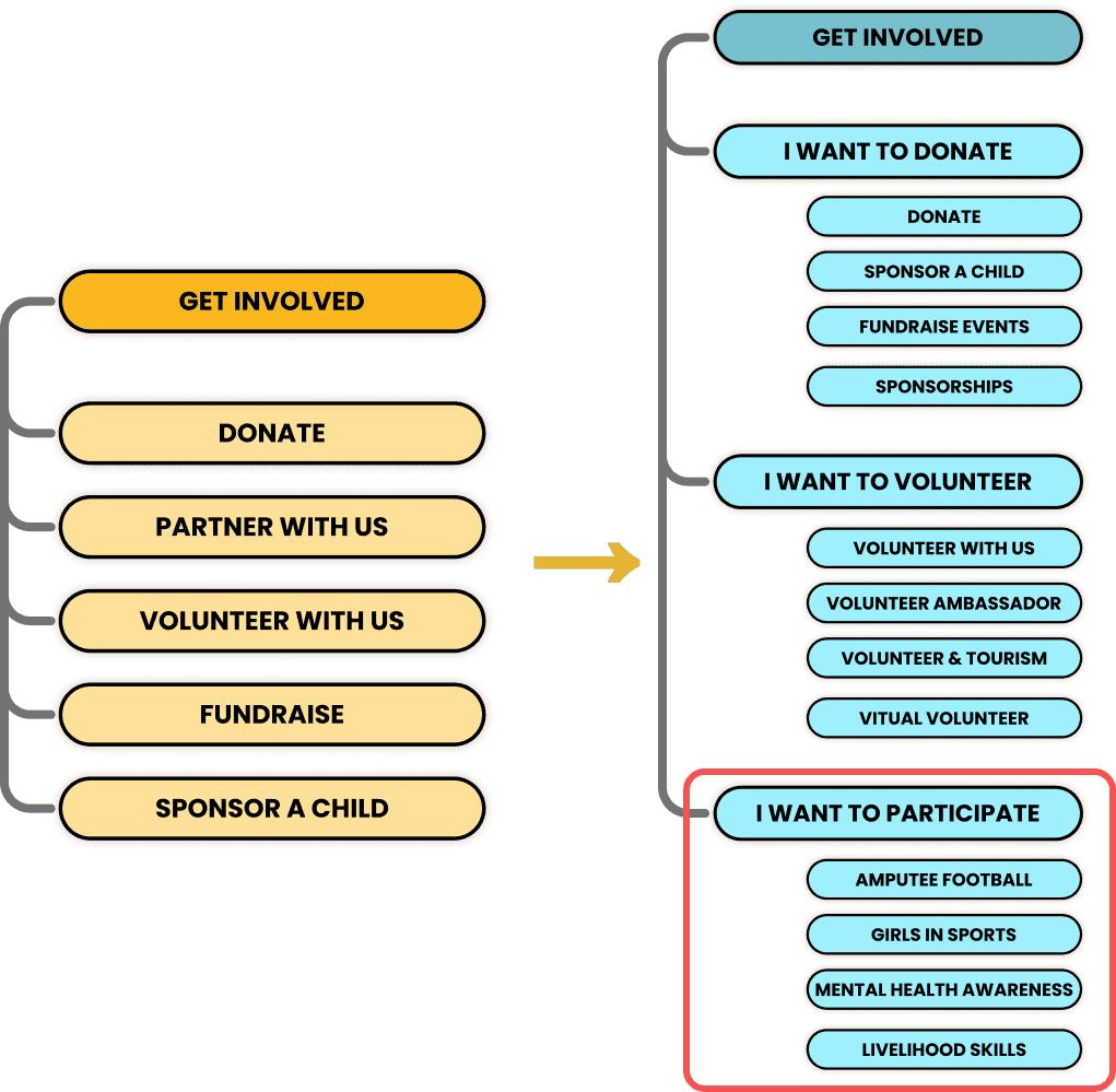 To address this, I updated the site's information architecture to create a more intuitive navigation system and introduced a more seamless system for user involvement by clearly distinguishing between donating, volunteering, and participating.