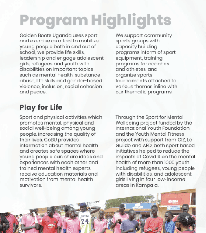 Golden Boots Uganda (GBU) is a nonprofit organization that empowers youth through various programs focused on inclusion, education, and community health. Their work supports young people- especially those with disabilities, trauma histories, or who face systemic barriers, by building life skills, confidence, and opportunity through soccer and holistic care.