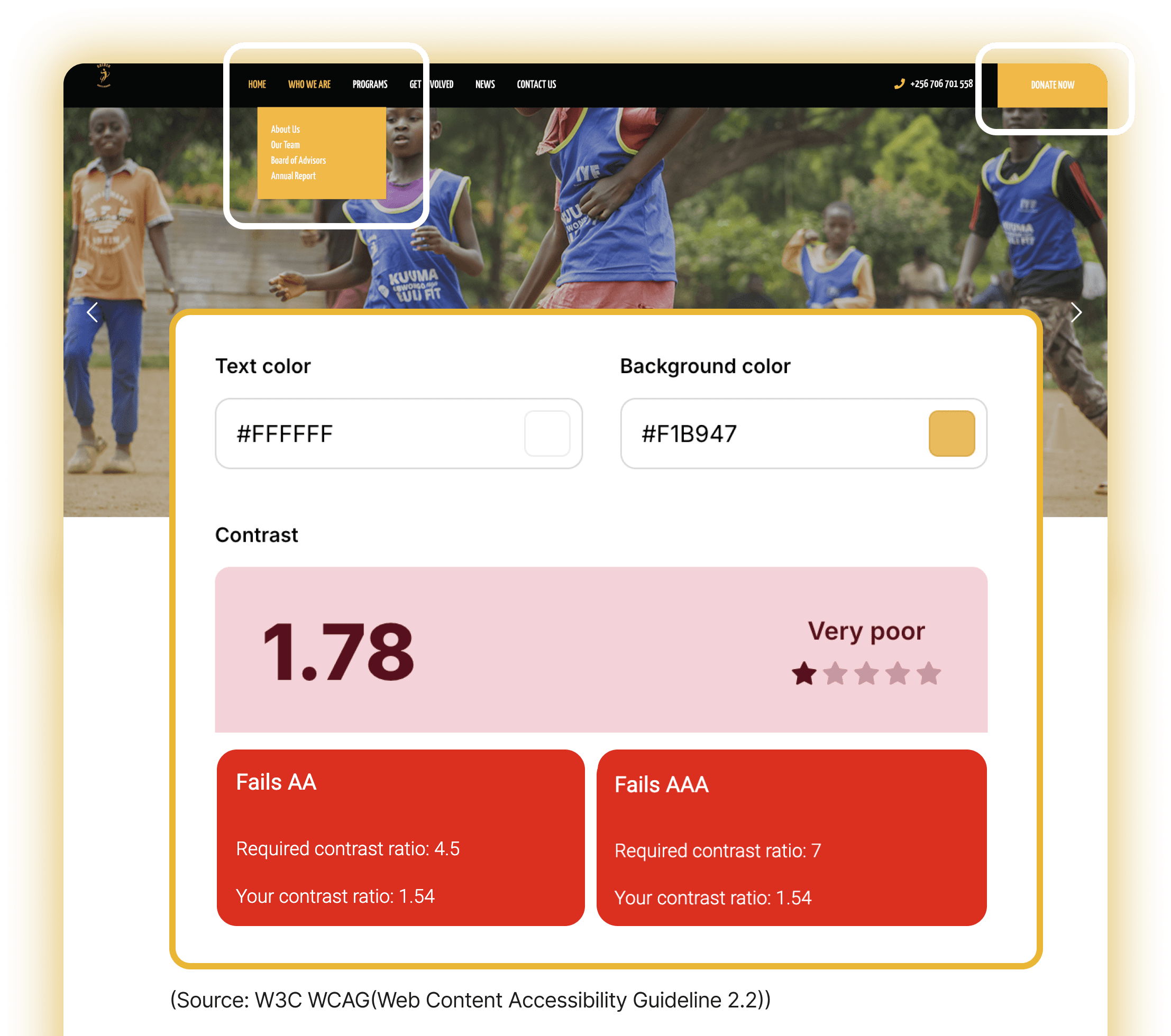 GoBU's original site had a Color accessibility issue: White text on yellow backgrounds fails WCAG 2.2 color contrast standards, making content unreadable for users with color blindness.